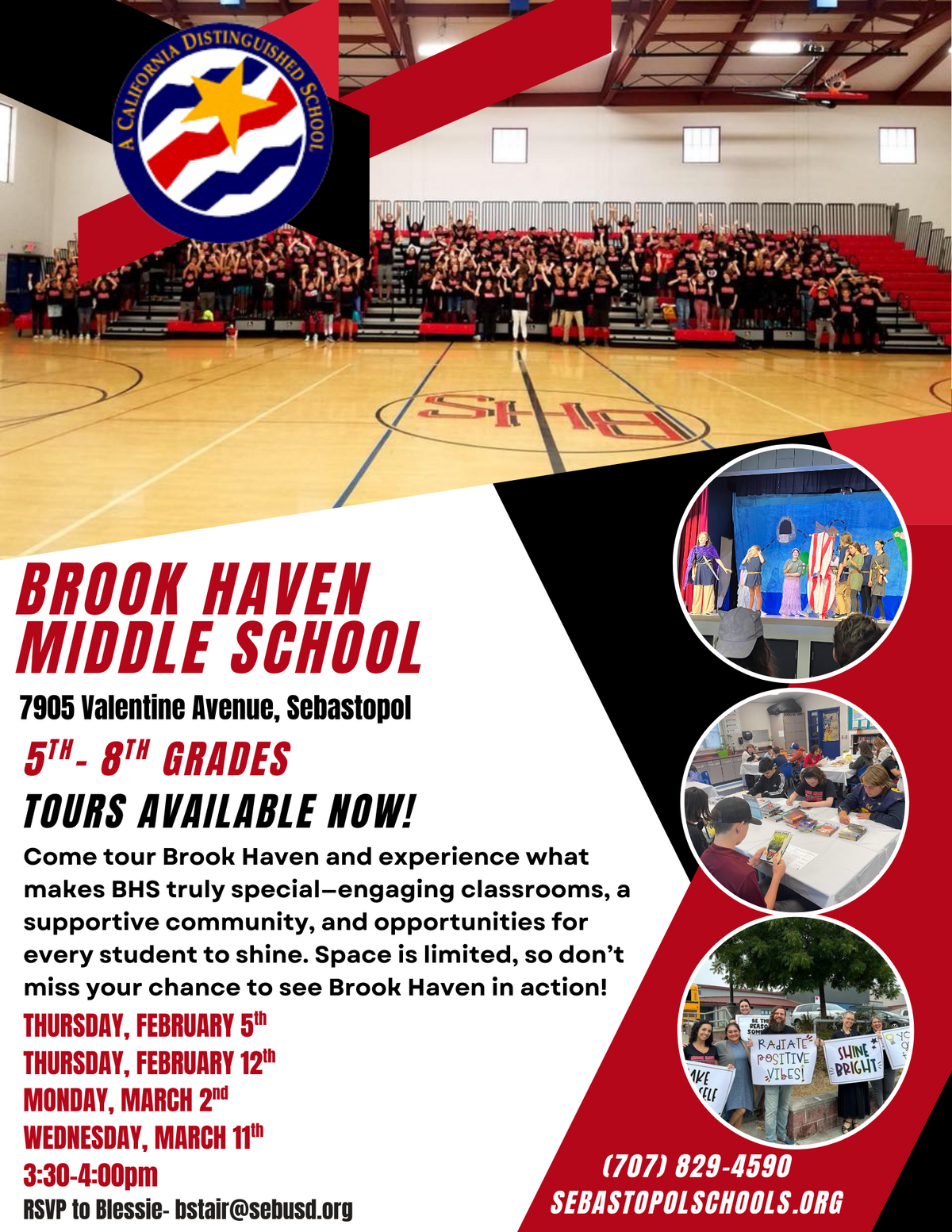 Brook Haven Middle School is home to Sebastopol Union School District's fifth- through eighth-grade students. Brook Haven has been an integral part of the local community for over 50 years. The school facilities are the hub for many community events and is the quintessential neighborhood school.