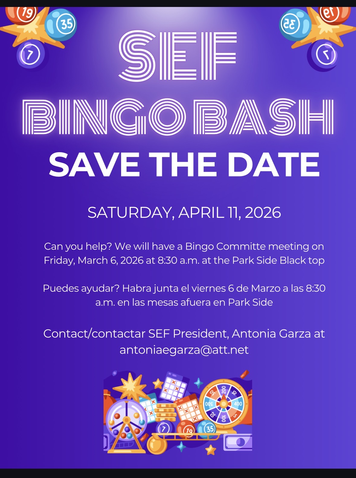 We need your help! Join the Bingo Bash planning meeting on March 6th at 8:30 am at Park Side Elementary School.